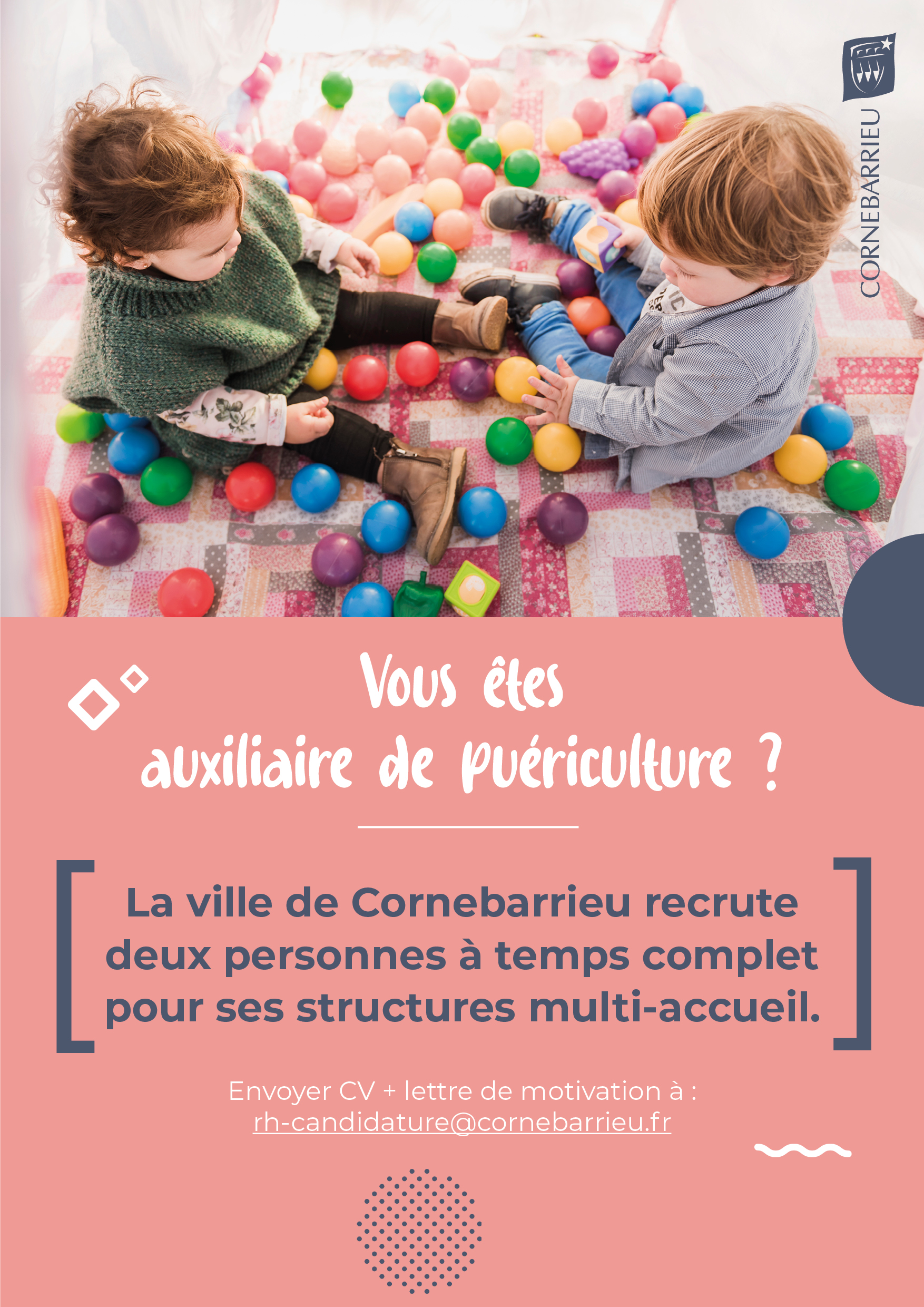 Votre êtes auxiliaire de puériculture et vous souhaitez vous investir à temps complet? Nous avons deux postes à vous proposer sur nos structures multi-accueil. Consultez l’offre et envoyez votre candidature à rh-candidature@cornebarrieu.fr